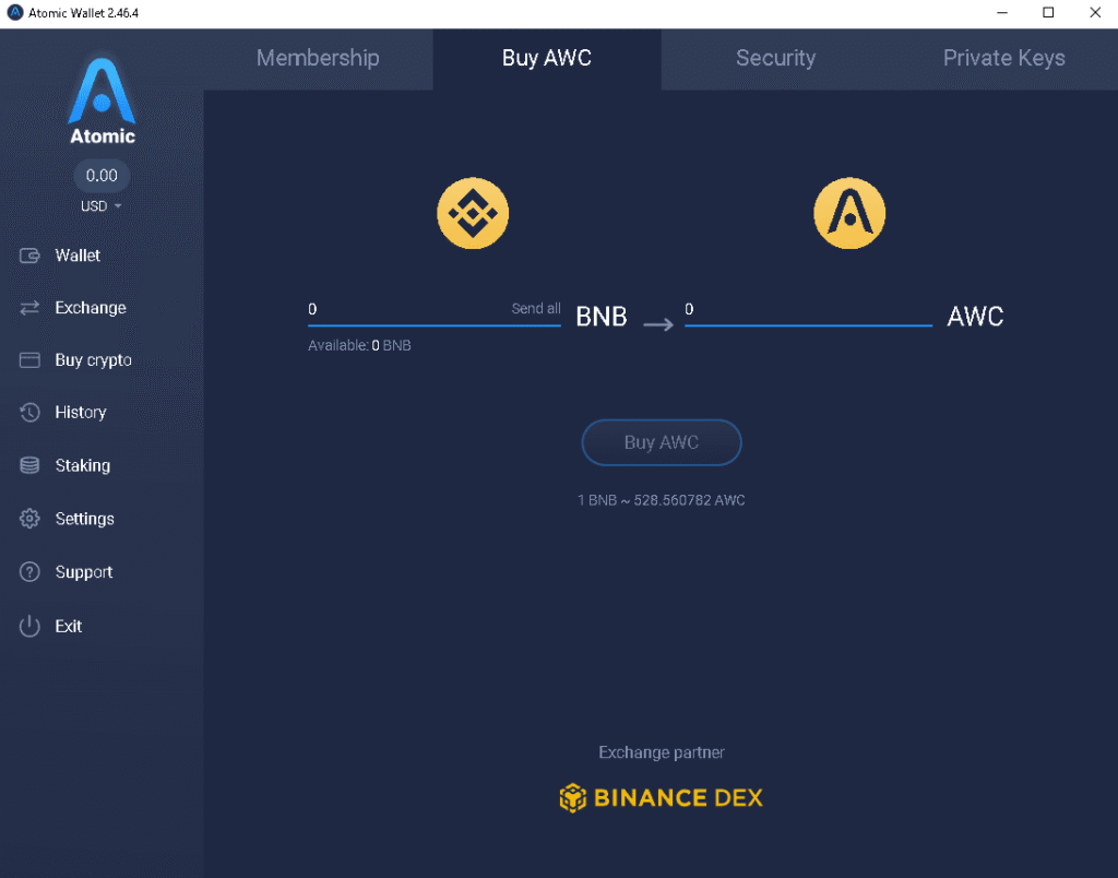 初めて開きましたが二つ目のタブを開くとAWCトークンの購入画面が出てきます。ExchangeパートナーがBinanceDEXとなってます。