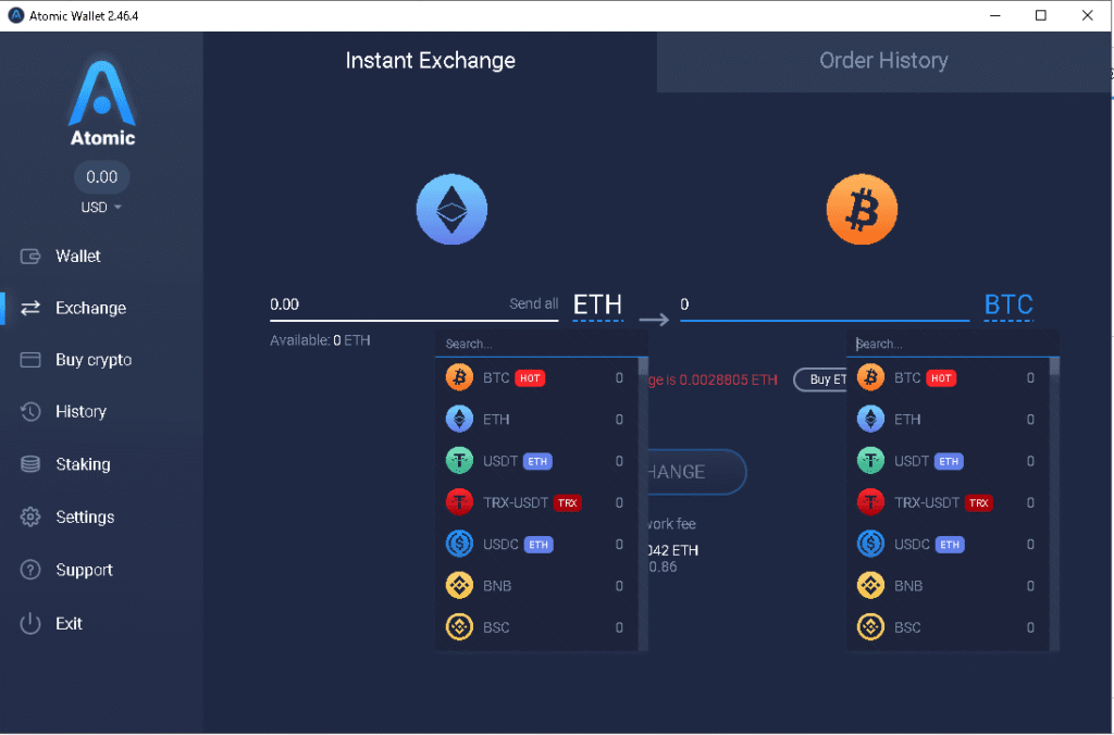左メニューでExchangeをクリックすると両替メニューが出てきますので何から何に交換するか選択して両替できます。ただし両替専門ではない(Binance、Kucoinではない)ので両立が悪かったり、手数料が高かったりします(なので両替え所をお勧めします。そのあとに自分のアドレスに送るなど)。