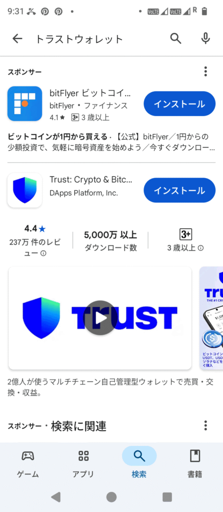 アップルapp store もしくはグーグルストアで検索”トラストウォレット”もしくは”Trust Wallet”を検索します。